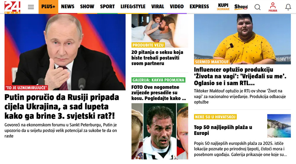 Već na prvi pogled uočava se da novinski portali obavezno medijske sadržaje kategoriziraju u rubrike. Teme koje se tradicionalno najviše vezuju uz tabloidni stil (osobni detalji iz života slavnih osoba, seks, skandali, nadnaravni fenomeni) na navedenim su portalima objedinjene unutar zasebne skupine članaka, koje se nazivaju Scena, Magazin, Showbizz, Show, Showtime, Zanimljivosti, Zabava i sl. Klikom na ponuđenu rubriku obično se otvaraju i određene potkategorije, npr. Domaće zvijezde, Strane zvijezde, Celebrity, Reality, Estrada, Čudne vijesti, Misteriji, TV. Portali tako na sadržajnoj razini odjeljuju novinske tekstove prema tematskim kriterijima, pri čemu postoji i određena vrijednosna hijerarhija. Primjerice, vertikalnim listanjem (scrollanjem) naslovne stranice navedenih portala uočava se da se na samom vrhu obično prikazuju političke vijesti i izvještaji, dok se vijesti “trivijalnog” sadržaja pojavljuju zajedno tek pri dnu naslovne stranice, obično uz sportske ili promotivne tekstove. Time se ujedno i implicira da uredništvo stavlja veći naglasak na sadržaje koji su prema uvriježenom shvaćanju “ozbiljniji”, tj. na članke iz svijeta politike, ekonomije, obrazovanja i sl., usprkos činjenici da donose model infotainmenta te obrađuju i tzv. “meke” vijesti. Zanimljivo je da su na naslovnoj stranici 24sata, za koje je već spomenuto da među popularnim domaćim portalima najviše odgovaraju klasičnom tabloidnom modelu, odabrani članci više tematski raspršeni. Drugim riječima, iako je bojom nadnaslova kao semiotičkim signalom naznačeno o kakvoj je rubrici riječ, raspored članaka na naslovnoj stranici znatno je manje vođen načelom tematskog ili žanrovskog grupiranja (v. Slika 8).
