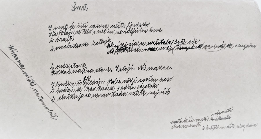 Promotrit ću sada rukopisne inačice pjesme „Smrt”. One potvrđuju da je Antun Branko Šimić ustrajno tragao za najprikladnijim umjetničkim oblikom svake misli, teme, motiva, poetske slike, za ekspresivnim ritmom, za izrazom koji će vratiti „djevičanstvo” stvarima i riječima.8 Nastojat ću izdvojiti i prokomentirati ono što je u svakoj inačici različito u odnosu na objavljeni tekst pjesme.