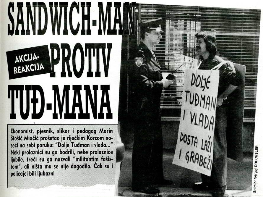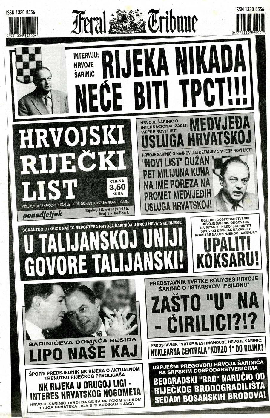 Među svim spomenutim ona je jedina i grafostilistički zanimljiva, jer parafrazira prototekst i na razini uporabe drugoga pisma. Ni ovaj zapis doduše ne preuzima i razliku ijekavica/ekavica (kao ni referiranje na isti grad), ali ovaj se put doista radi o transliteracijskoj figuri, onako kako smo je definirali, jer se ovdje ćirilicom transliterira hrvatsko ime za jedan talijanski grad. Parafraza se pojavila u satiričkom dijelu Ferala, znači u onom u kojemu su se fikcija i stvarnost slobodno prepletali, i to na naslovnoj stranici fiktivnih novina Hrvojski riječki list, zapravo parodijske stilizacije stvarnih novina Riječki list. Satirički se naslov pojavljuje kao citat iz izmišljenog intervjua s tada jednim od najeksponiranijih hrvatskih političara, Hrvojem Šarinićem, koji se u ovoj satiri prikazuje i kao reporter, gospodarstvenik, predstavnik različitih tvrtki, predsjednik nogometnog kluba i kao štošta drugo u vezi s riječkom sredinom. U premještenom (fiktivnom) kontekstu tom se porukom istovremeno aludira i na „Osječki plakat“ i na tršćansku krizu poslije Drugog svjetskog rata. Naslov zapravo sjedinjuje dvije od tema koje su među najspominjanijima u jezičnim porukama s ove naslovnice – onu u vezi s talijanskom manjinom (spominjanje Trsta, uz aluziju na teritorij koji je Jugoslavija „izgubila“ nakon Drugog svjetskog rata) i onu u vezi s tzv. srpskim pitanjem u Hrvatskoj (dio natpisa je na ćirilici, a on sam evocira „srpsku“ konotaciju s prototeksta). Ispisivanje imena talijanskog grada na ćirilici u ovoj parafrazi proizvodi humorni efekt srodan onome u grafitu <SINJ NIKADA NEĆE BITI SENJ>. (Kako bi Sinju moglo prijetiti da postane Senj!? Kako bi Rijeka mogla postati srpski Trst!?) Na djelu je dakle neka vrsta depatetiziranja predloška radikalnom besmislicom koja tek nalikuje na prkosnu (lokal)patriotsku eksklamaciju.