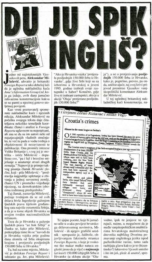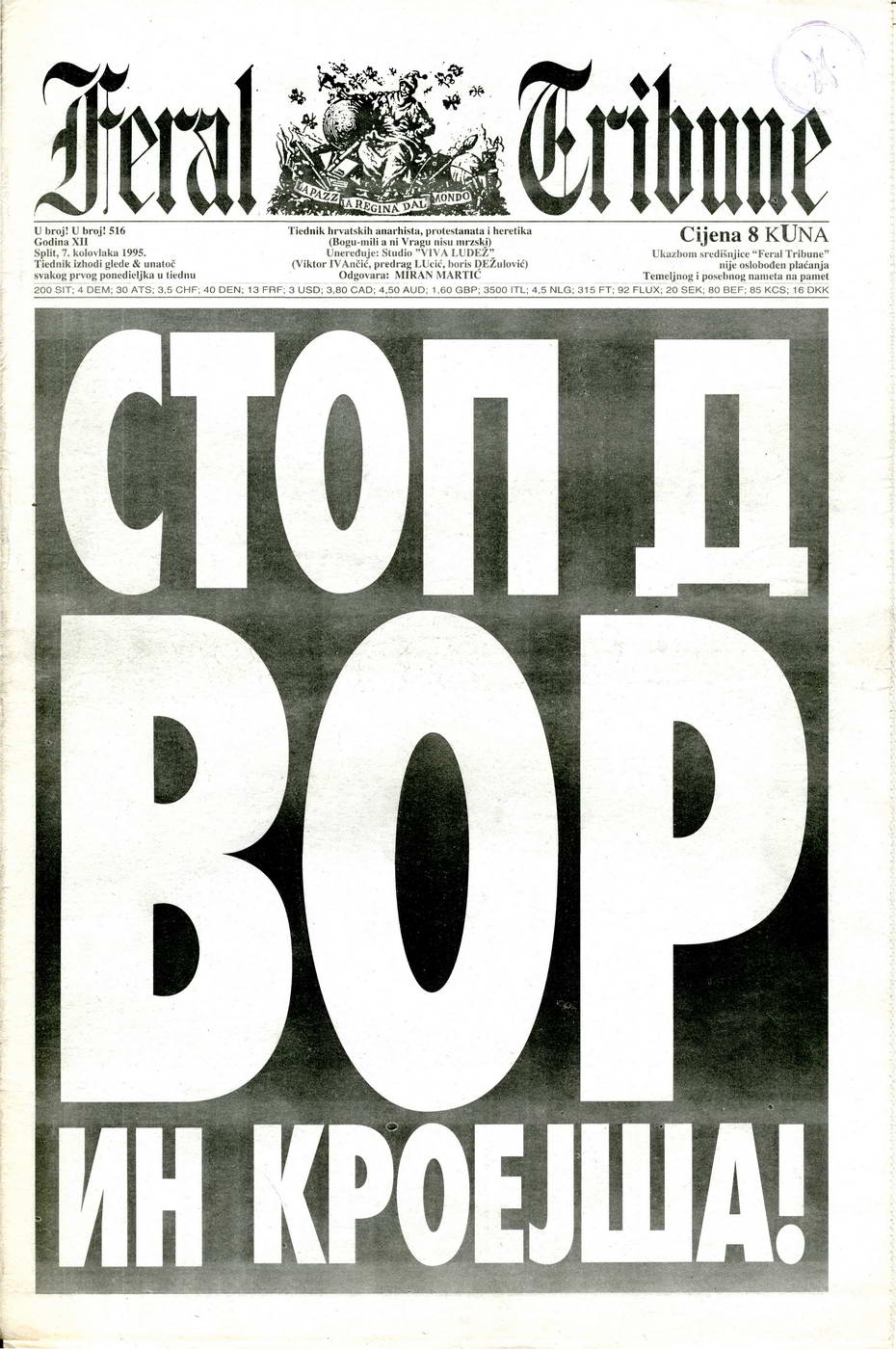 Jedna od Feralovih poznatijih naslovnica donosi pak primjer hibridne transliteracijsko-grafodomestifikacijske figure. Ondje se tijekom Oluje pojavila ironična parafraza apela „Stop the War in Croatia“, koji su zvijezde hrvatske zabavne glazbe u formi refrena i naslova pjesme odašiljale međunarodnoj zajednici početkom rata, u obliku <CTOП Д BOP H KPOEJШA!> (FT 516: 1). U toj ćiriličnoj grafodomestifikaciji, koja evidentno polemički dijalogizira s prototekstom, izbor pisma konotira nacionalnu pripadnost tobožnjih pošiljatelja poruke, „fonetiziranjem“ se stilizira njihov krut, „slavenski“ izgovor stranog iskaza, a sama jezična poruka, uz ostalo, crnohumorno upućuje na tobožnju namjeru pošiljatelja da u trenutku ekstremne ugroženosti izraze lojalnost onoj državi čiju samostalnost nisu podržali i čija ih vojska sada napada.