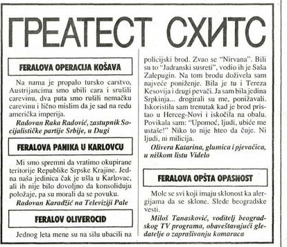 U Feralu nailazimo i na jedan primjer prilično rijetke figure zapisa – transliteracijske figure. Potonje se temelje na postupcima transliteracije, „prijenosu jednoga slovnog sustava (sustava slova jednog pisma) u drugi slovni sustav (u sustav slova drugog pisma)“ (Badurina et al. 2007: 221). To su figure koje imaju svoju osnovu u transliteraciji slovnog sastava riječi ili iskaza tuđim (ili neslužbenim) pismom.2 Tako je Feral u redovitoj rubrici Greatest Shits jednom prigodno objavio i podrubriku čiji je naslov ispisan neuobičajenom transliteracijom slovnog sastava poruke na engleskom jeziku na srpsku ćirilicu, <ΓΡΕAΤECT CXИTC>, čime se signaliziralo da je riječ o bizarnim citatima iz srbijanskih medija (FT 517: 36).