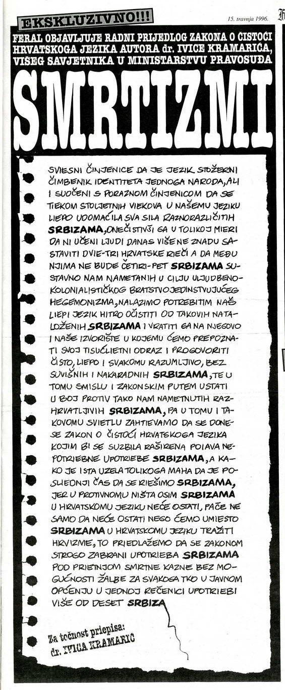U jednom kritičkom komentaru u Feralu povodom neke teme u vezi s jezičnim purizmom 90-ih uporabom zapisa <priedlozima>, umjesto <prijedlozima>, također se parodijski stilizira onaj diskurs koji afirmativno evocira doba NDH, kada se nastojao uvesti tzv. korijenski pravopis:
