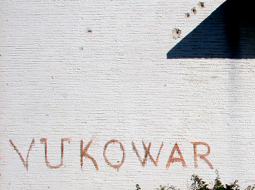 Sâm zapis često i ne proizvodi političke konotacije kada ga se zatječe u kontekstu odavanja počasti i prisjećanja na žrtve i razaranja. Ekspresivnosti, pa i apelativnosti, često pridonosi i crvena boja kojom se dodatno istakne riječ war, što simbolizira žrtvu stradalih stanovnika i branitelja grada, ali ni to ne daje nikakvu posebnu političku dimenziju figuri. Ona se međutim javlja onda kada njezine uporabe i isticanja u pojedinim kontekstima priječe promjenu percepcije samog grada i konstruktivno rješavanje njegovih problema, među kojima su bitni i oni međuetničke naravi. Kao ekstrem moglo bi se navesti ispisivanje grafita u kojemu se ovaj zapis pojavljuje s „rogatim“ ustaškim <U>, kojime se evociranje ratnih stradanja združuje sa simbolom međuetničke mržnje.
