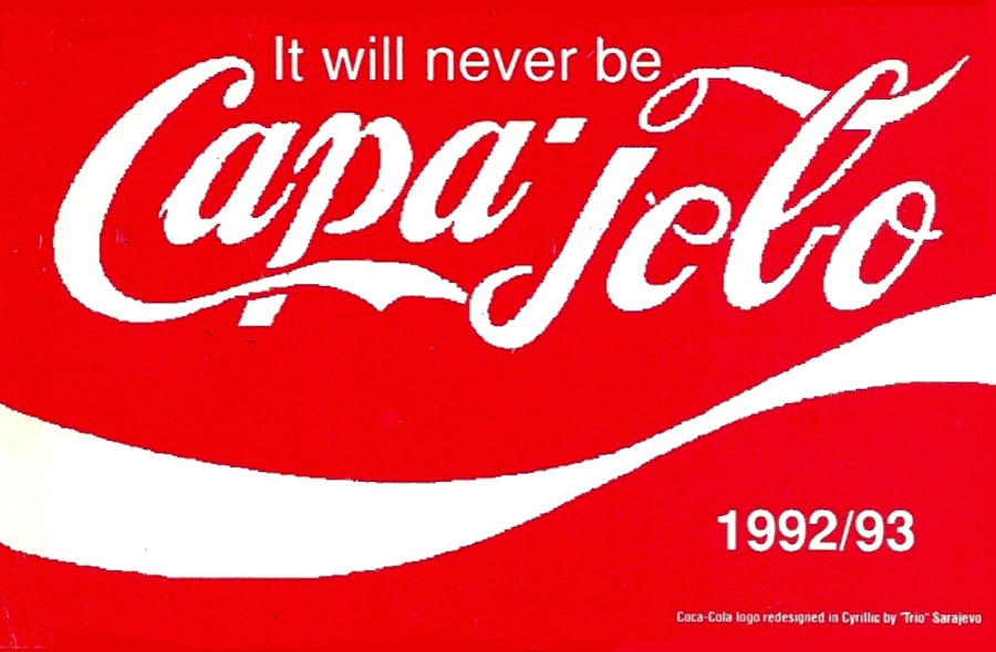 11 Za vrijeme sarajevske opsade pojavila se dvojezična i dvopismovna poruka također dojmljiva dizajna sa sličnom porukom i konotacijama, u kojoj se međutim miješaju engleska latinica i srpska ćirilica. Autori su potpisivani kao Trio, a njihova je najpoznatija grafika ona koja poručuje „Enjoy Sarajevo“, također stilizirajući Coca-Colin logotip (v. primjer 16).