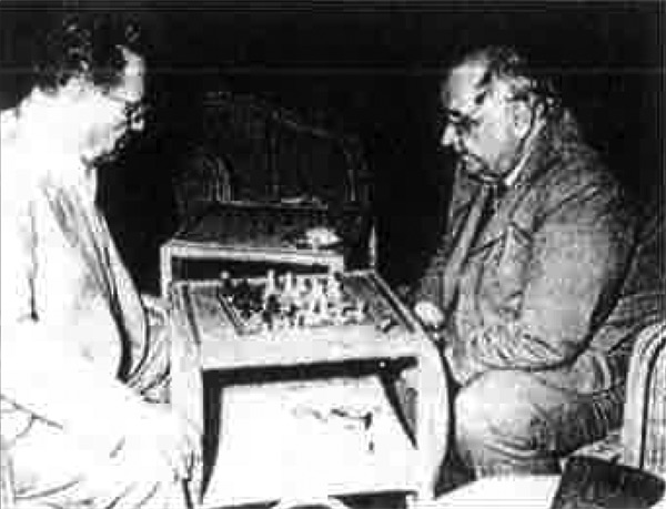 Dva »fetiva« kajkavca (i očevidna pušača) nad šahovnicom na Brijunima šezdesetih... Ako je partija (dakako: šahovska) na »fotki«, autentična, pomnijim očevidom dade se razabrati da su si partneri »pojeli« po tri pješaka i figuru, bijeli (Krleža) crnome (Titu) – konja, crni bijelome »laufera« (= lovca), onda partija »miriše« na remi: a tko je komu zadao šah-mat, to – dabome – ne: zna se...