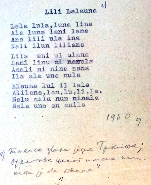 0. Pjesma Lili Lalauna napisana je 1950, a prvi put objavljena 1976. u Sabranim delima Ive Andrića u 16 toma (Andrić 1981/11: 241). Original se čuva u Zadužbini Ive Andrića u Beogradu (kutija br. 46). Tekst je otkucan pisaćom mašinom na listu formata A4: 21 × 29,5. Da pjesma pripada Ivi Andriću, potvrđuje autorovom rukom napisana fusnota: Тако се звала једна Гркиња; од слогова њеног имена начињена је ова „песма“. Iza godine 1950. dolazi latinična skraćenica: g. Leksema песма stavljena je u navodnike, ali naknadno (da ovaj interpunkcijski znak ima različitu boju u odnosu na druga slova).