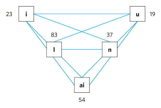 U pjesmi se pojavlju tri samoglasnika (a, i, u) i dva suglasnika (n, l). Nema, dakle: o i e, koji su jedini na artikulacijskoj vertikali srednjeg reda (a je niski, i i u su visoki).4 Horizontalno sva su tri različiti: i je prednji, a srednji, a u zadnji. Samoglasnik a je otvoren, i i u su zatvoreni. Samo se u odlikuje labijalizacijom.