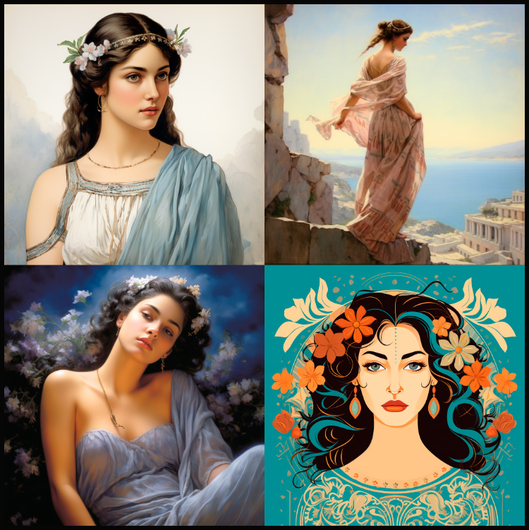 71. Drugu V-Int koja automatski generiše samo ilustracije – Midjourney zamolili smo da napravi sliku Lili Lalaune prema Andrićevim stihovima i autorovom napomenom (fusnotom) o tome da se radi o jednoj Grkinji. Midjourney je ponudio četiri varijante.133