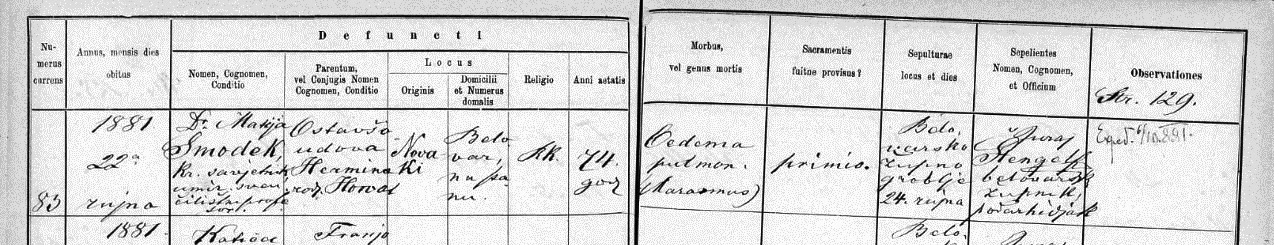 Slika 3. Upis Matije Smodeka u Matičnu knjigu umrlih Župe sv. Terezije u Bjelovaru (izvor: internetska stranica FamilySearch)