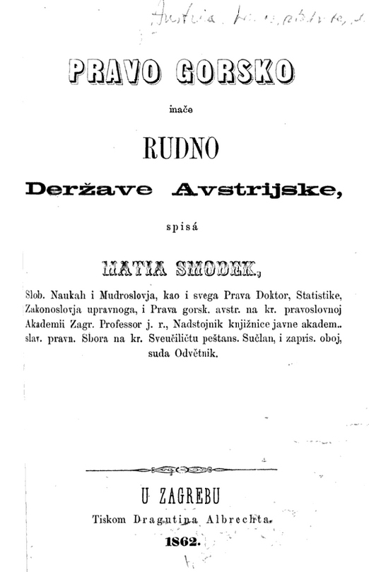 - Smodek, Matia. 1862. Pravo gorsko inače rudno Deržave Avstrijske. Zagreb: Tiskom Dragutina Albrechta.