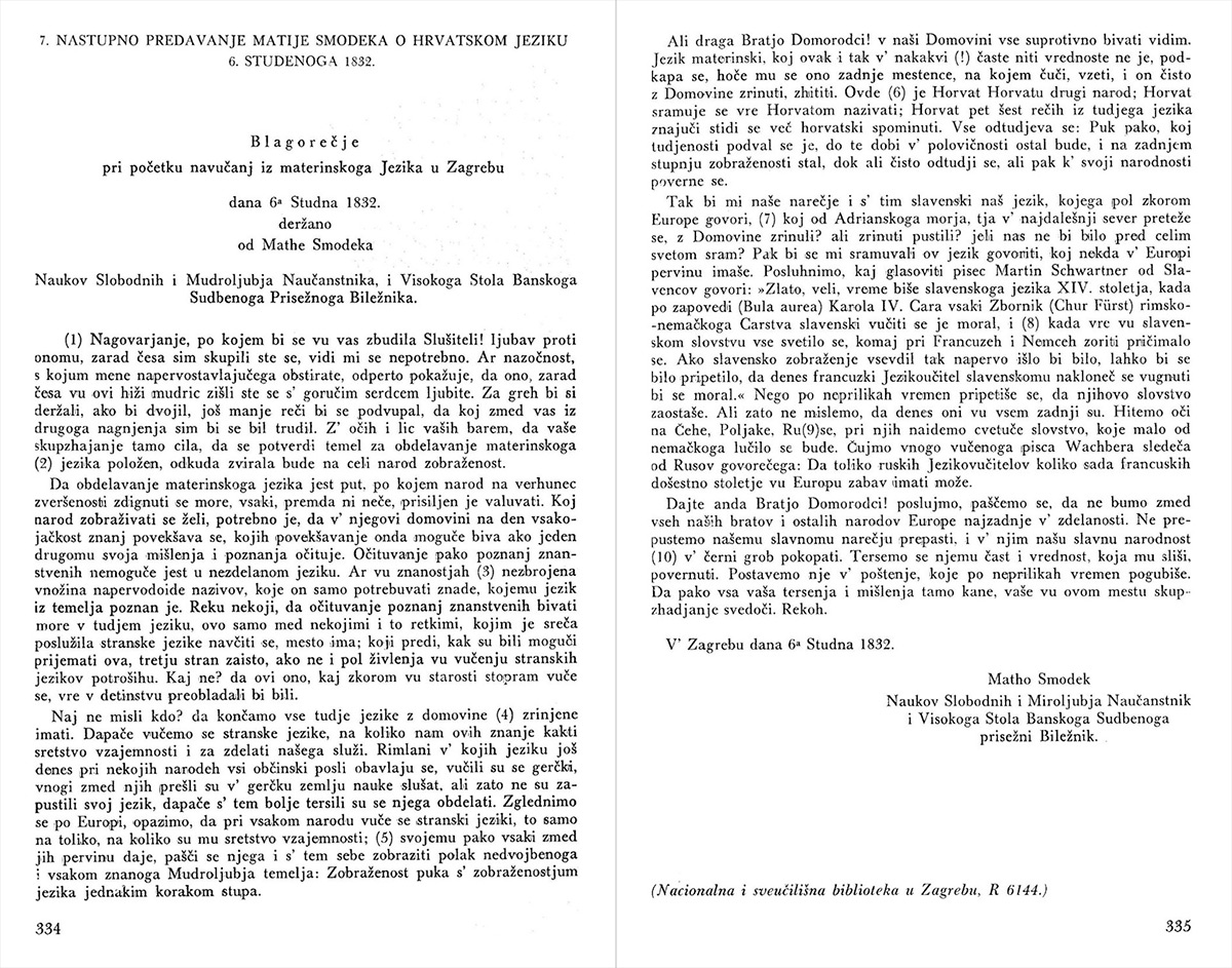 Našemu jeziku prvi je počeo učit profesor Smodek, tada se iza dokončenoga prvoga lěta prava iz Pešte u Zagreb povrativši, pokojnim Kolarom nagovoren, da učini čtogod za svoj narod. Ako se ne varaju, bilo je to godine 1833-e. On oprosì nekoliko profesorov da mu dopuste našemu jeziku javno učiti, a koji dan poslě rečè mi pokojni Rakovec, moj sužitnik, da su te Smodekove lekcije na akademičkoj dasci pribite, nu da Magjarski učenici (za razplod Magjarstva u Zagreb pošiljani) strašno žamore te govore, da iz toga ne bude ničta, i da se to vse istom na saboru Požunskom pretresti i rěšiti ima. Rekšû Rakovcu da ga je strah, da od ista od vsega toga t. j. namišljenih lekcii Smodekovih ničta ne bude, profesorom toga se žamora plašećim i po prilici od podanoga dopusta odstupećim – ja mu zavrnuh: »Učinimo čtogod!« Kad ga viděh skučene glave kdě ramenima stišće, sgrabih ljut ono hartije na stolu te na dvanajst ju koliko li cedulic razkrojiv, u tri jezika nečto pisati stadoh, Hrvatski, Latinski i Němački. Oficirskû sinu jezik mi Hrvatski nikako nije od ruke išao, Latinski traljavo, nu Němački dobro. Kad bude oko pol noći, a ja pred akademiju, te utiskoh one cedule u okno, dobro ne klipajuće. Kad u jutro, al moj prijatelj Drkos, Vukmanac, prvi u školu (bio je jurista i convictista, napisavši malo kašnje poznatu knjižicu: »Genius patriae supra dormientibus ejus filiis«). Uztrebà mu hartije te razgledav se po školi upazì cedule kdě kroz okno štrlje. Pročitav ih (kako smo vikli) začudì se čemu li su naměnjene, te s njimi brže nazad u školu, te čitaj pred učenikî medjutim se skupivšimi. Ne umiju danas reći, čto je na vsakoj bilo, ele na triu bilo je ovako: »Hört! Einige Leute, die wohl wissen sollten, was lingua patria heisst, die haben gemeint, das wäre ungarisch! Wird nicht Europa unserer spotten? (Tuj sam migao na pokojnoga kanonika Mihića, ravnatelja u konviktu, kojega moj prijatelj Drkos biaše oprosio da smě slušati "praelectiones e lingua patria" na čto mu ovaj začudjen: Quales? e lingua Hungarica?«) Na drugoj: »Wer sind die Kroaten? friedliche Unterthanen in Friedenszeiten, tapfere Krieger in Kriegszeiten, Besieger der Avaren, Türken und Tartaren, also freie Männer, keine Ungarnknechte!« Opet na drugoj: »Ein jeder Mensch ist frei geboren, und jede Nazion hat das Recht, sobald sie von einer andern unrechtmässiger Weise bedrückt wird, sich los zu machen. Nord-Amerika hat sich von England, Süd-Amerika von Spanien losgemacht; auch uns hat kein unerbittliches Schicksal für immer an Ungarn gekettet, und wenn es darauf ankommt, nieder mit den Ungarn!« Iza toga čitanja nastala strahovita rvanja i skubanja med Hrvatî i Madjarî.« Familias sa katedre viče: »Silentium dominationes« nu slabo je pomagalo, er gospodičići biahu poběsněli. Dozovu Henfnera, profesora naravnoga prava, Němca iz Spiša (= Scepusium, die Zips) čověka tada puno obljubljenâ, nu ni on ničta ne opravì. Napokon dojdè stari, ćelavi, buckasti Domin, nosa zakučastâ, vàs uzpiren, te k mladićem: »Quid putant, quid cogitant, quid denique rerum meditantur dominationes? quam terribile vel nomen revolutionis itd.« Njegovom se besědom vatra malo prigasila, nu u srdcu omladine to još tinjalo, te po ulicah kděkad i buknulo, kad bi se naměrila kosa na brus. (Kurelac 1862: 182–183)